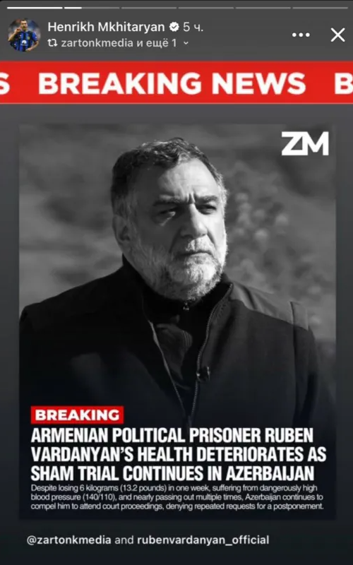 Հայաստանի ազգային հավաքականի բոլոր ժամանակների լավագույն ռմբարկու, «Ինտերի» կիսապաշտպան Հենրիխ Մխիթարյանն իր աջակցությունն է հայտնել Բաքվում ապօրինի պահվող Արցախի նախկին պետնախարար Ռուբեն Վարդանյանին։