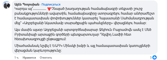 «Հայաստանի և Ադրբեջանի միջև խաղաղության համաձայնագրի նախագիծը համաձայնեցված է և սպասում է ստորագրման։ Ես պատրաստ եմ իմ ստորագրությունը դնել այդ փաստաթղթի ներքո»,- ֆեյսբուքյան էջում հայերեն և անգլերեն լեզուներով գրել է Նիկոլ Փաշինյանը։