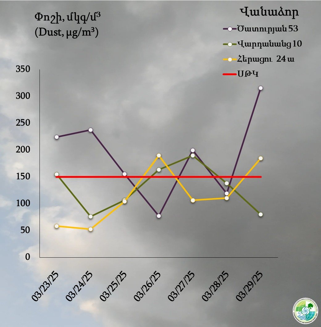 Հիդրոօդերևութաբանության և մոնիթորինգի կենտրոնը ներկայացրել է Հայաստանի քաղաքների մթնոլորտային օդում փոշու պարունակության մասին տվյալներ՝ մարտի 23-29-ն ընկած ժամանակահատվածի համար։