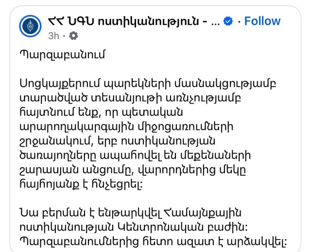 Մենք ոչ թե Հայաստանի Հանրապետության ներքին գործերի նախարարություն ենք, այլ նիկոլ փաշինյանի հաստատած հակահայ ու հակաիրավական ռեժիմի զինված պահակախումբ։ Ուստի երբ որ պետք է՝ պատրաստ ենք օրենքի խախտմամբ ուժ կիրառել ռեժիմի խաթրին կպնող մարդկանց նկատմամբ, նվաստացնել, ստորացնել, խոշտանգել նրանց։ Մենք անպատժելի ենք ու ինչ անում ենք՝ լավ ենք անում։ Ձեզ էլ մաղթում ենք հանգիստ սպասել 2026 թվին ու հուսալ, որ կկարողանաք մեզ հաղթել արդար ու ցիվիլ պայքարում։ Խելոքներ»: