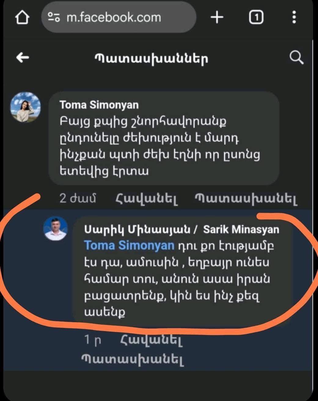Սարիկ Մինասյանը «ռազբորկայի» է կանչել իրեն մեկնաբանություն գրող կնոջ ամուսնուն կամ եղբորը