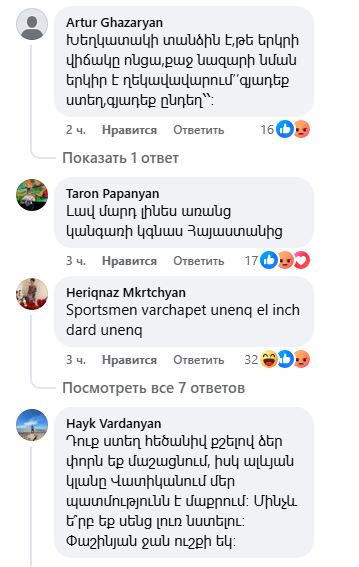 Փաշինյանի մարզական գործունեությանը, սակայն, քաղաքացիները արձագանքել են ծաղրով, քննադատությամբ, հայհոյանքներով, վիրավորանքներով, անեծքով։