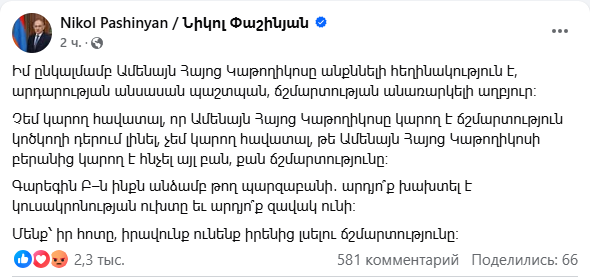 Նիկոլ Փաշինյանի գրառման ներքո բազմաթիվ օգտատերեր հարցադրումներ են անում, թե արդյո՞ք դա այն խնդիրն է, որով պետք է զբաղվի երկրի կառավարությունը, արդյո՞ք կաթողիկոսի՝ կուսակրոնության ուխտի հնարավոր խախտումն է մեր երկրի համար ավելի վտանգավոր եղելլ, թե՞ Արցախը հանձնելը, 5 հազար զոհ գտալը։