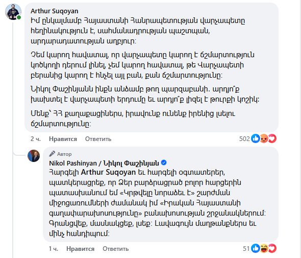 ԱԺ «Հայաստան» խմբակցության պատգամավոր Լևոն Քոչարյանի օգնական Արթուր Սուքոյանը ևս մեկնաբանել է Նիկոլ Փաշինյանի գրառումը՝ նշելով․ «Իմ ընկալմամբ Հայաստանի Հանրապետության վարչապետը հեղինակություն է, սահմանադրության պաշտպան, արդարադատության աղբյուր։