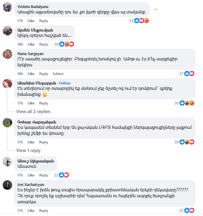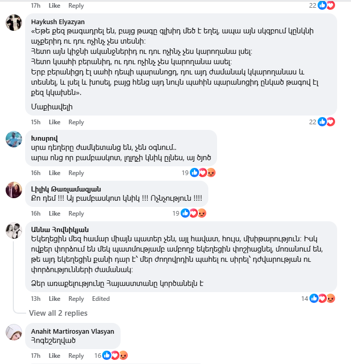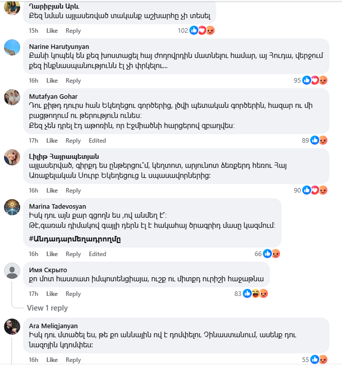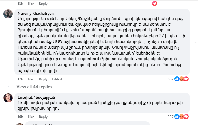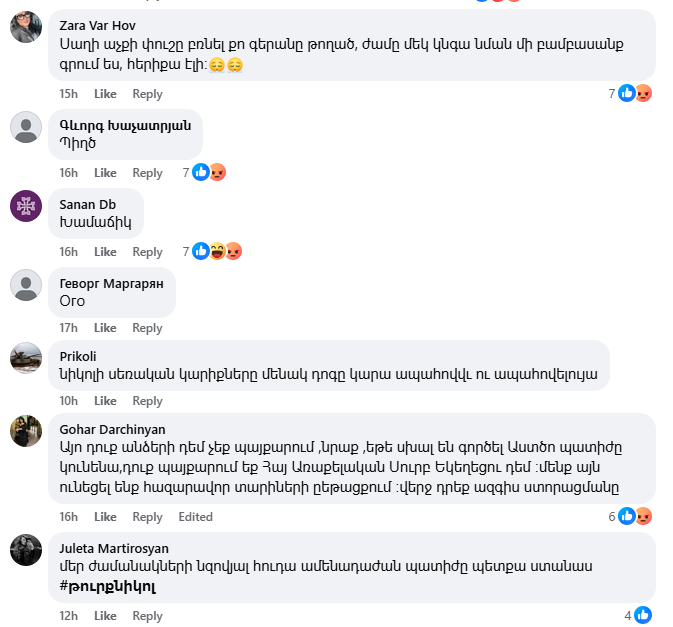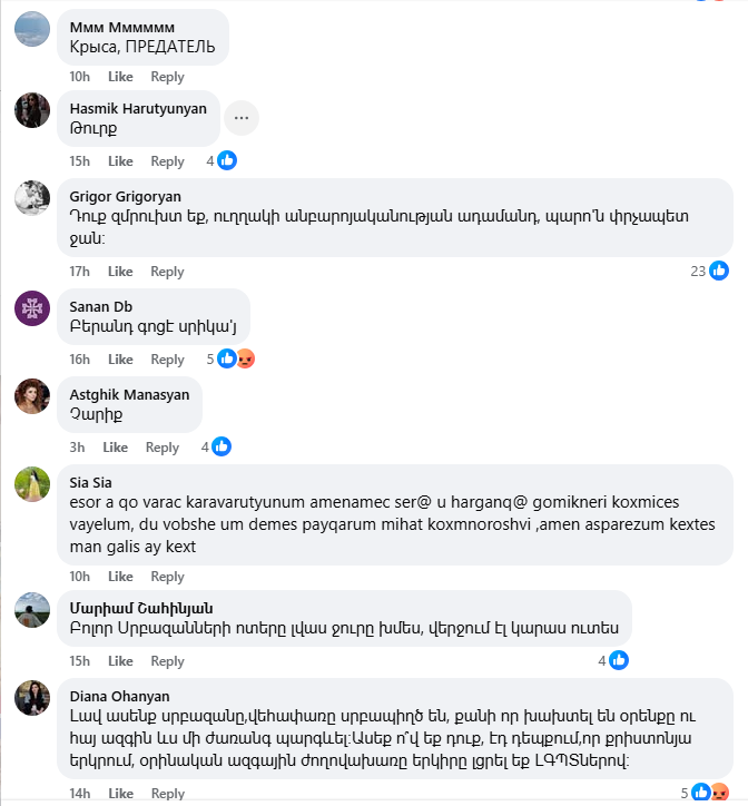 Նիկոլ Փաշինյանը, մեկ շաբաթ հայհոյախառն չգրելու խոստումից առաջ հերթական գրառումն է արել հոգևորականների դեմ։ Նշենք, որ Փաշինյանի գրառման տակ ավելի քան 1500 մեկնաբանությւոն կա և գրեթե բոլորը՝ հայհոյանքներ են, անեծքներ, վիրավորանքներ՝ ուղղված հենց իրեն։