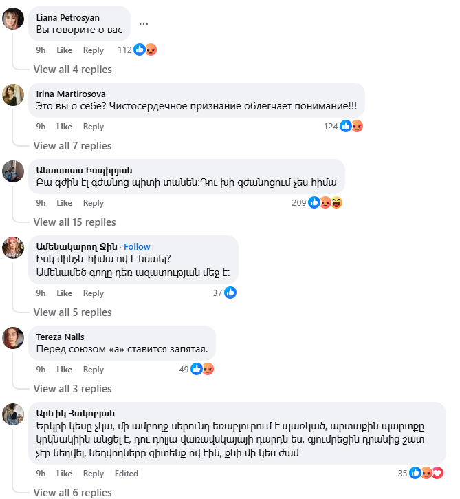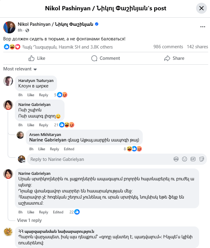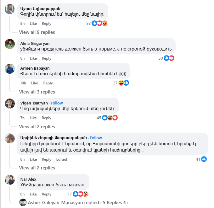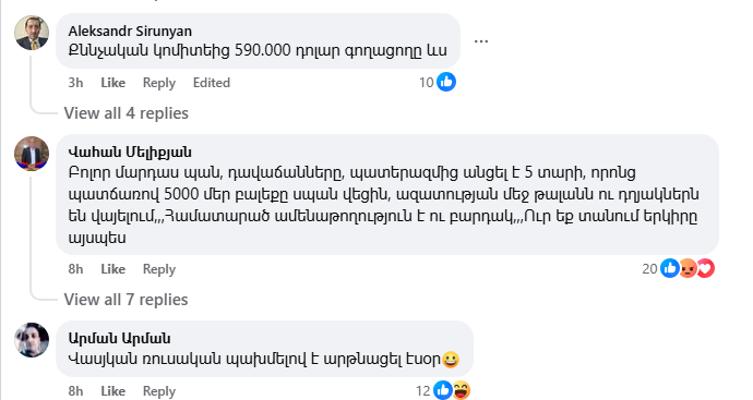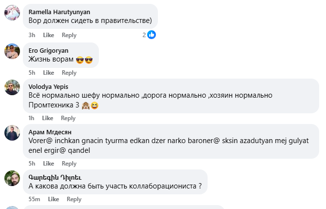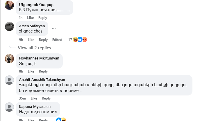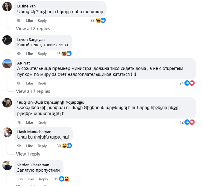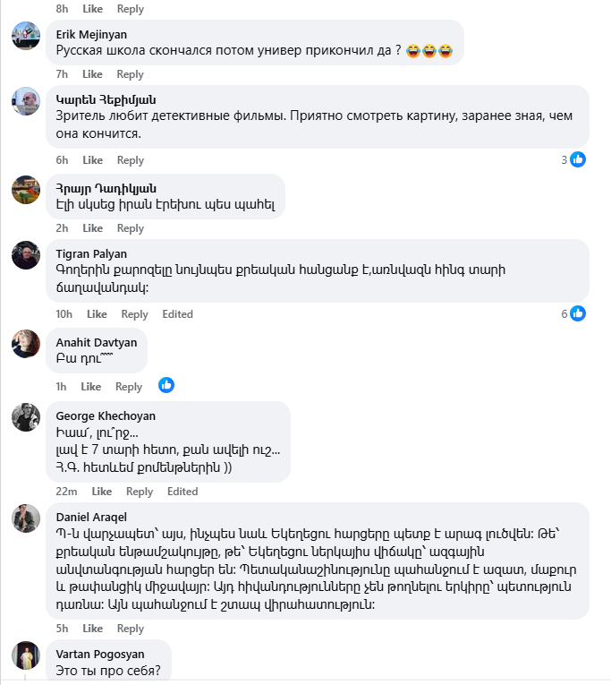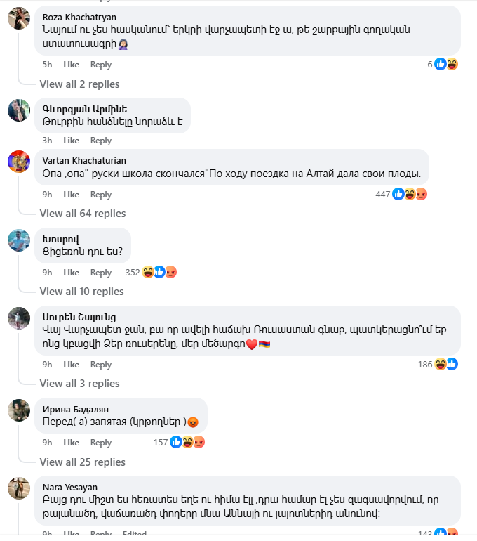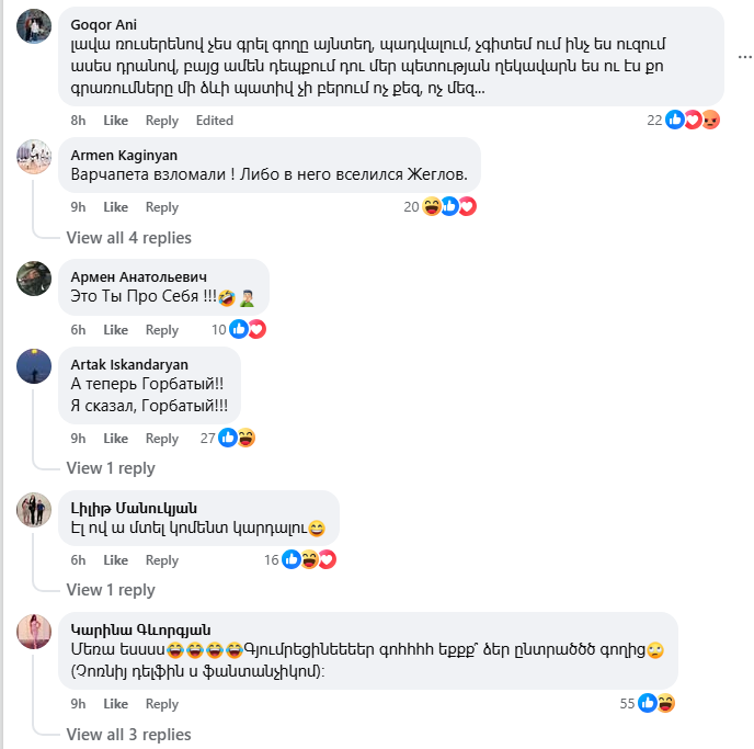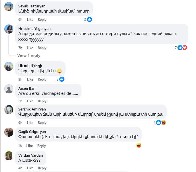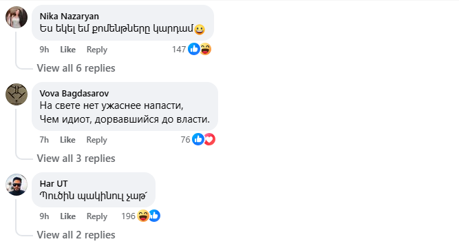 Այս գրառումը ունի շուրջ 1000 մեկնաբանություն։ Այս անգամ, ի տարբերությւոն նախորդ գրառումների, գերակշռում է ոչ թե Փաշինյանին ուղղված հայհոյանքը, այլ՝ ծաղրը։