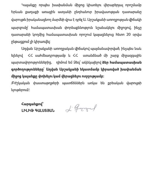Միջնորդագիրս պայմանավորված է Աղվան Արշակյանի առողջական վիճակով, ինչպես նաև բխում է ՀՀ սահմնադրությունից և ՀՀ ստանձնած մի շարք միջազգային պարտավորություններից։
