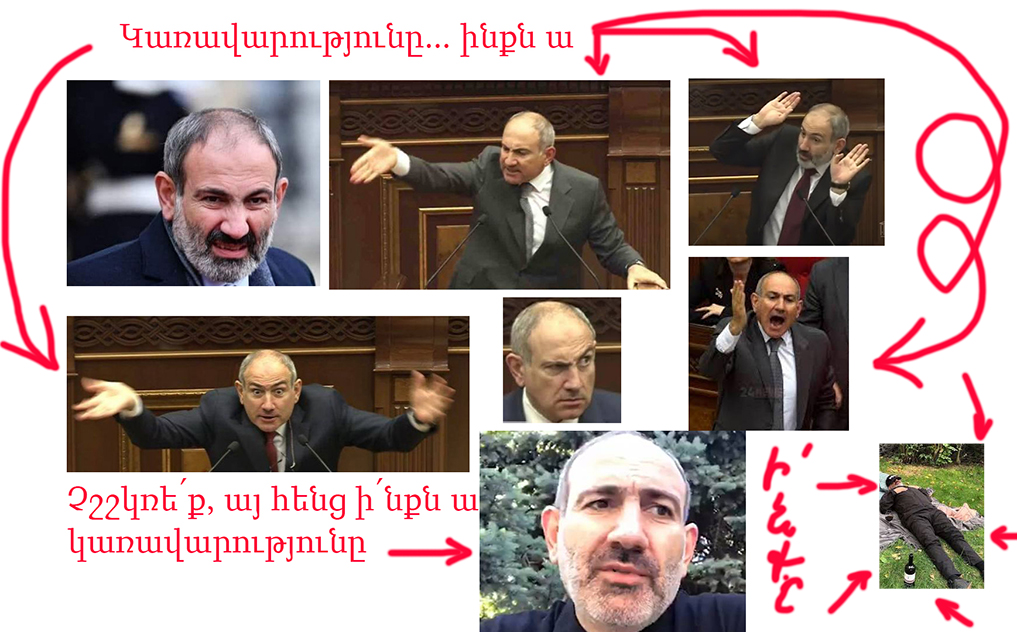 Լրագրողի դիտարկմանը՝ կառավարությունն է հայտնել, Փաշինյանն ասաց. «Կառավարությունը ես եմ, չի կարող որևէ մեկն իմ դիրքորոշմանը հակասող դիրքորոշում ունենա: Ընդհանրապես կառավարությունում եթե մարդիկ կան, որ իմ դիրքորոշմանը հակասող դիրքորոշում ունեն, հենց հիմա թող դիմում գրեն շենքերից դուրս գան, եթե՝ ոչ, ես ինքս նրանց կհանեմ»: