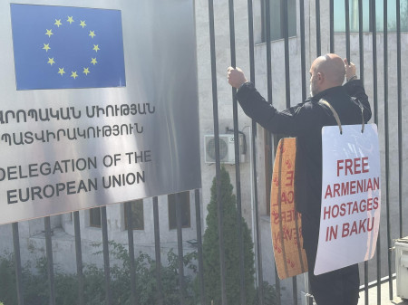 ՀՀԿ փոխնախագահ, մինչև վեջերս քաղաքական պատճառներով բանտարկված ու տակավին քաղաքական պատճառներով հետապնդվող Արմեն Աշոտյանը բողոքի միայնակ լուռ ակցիա է իրականացրե Հայաստանում ԵՄ պատվիրակության շենքի առջև՝ Փաշինյաի գործընկեր Ալիևի կողմից Բաքվում ապօրինի պատանդ պահվող հայերի ազատության պահանջով: