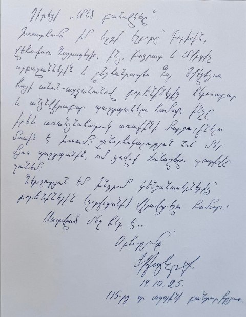 Խոնարհումս իմ եզդի եղբորը՝ Բորիսին, Վեհափառ Հայրապետին, ինձ, Բագրատ և Մկրտիչ սրբազաններին և ընդհանրապես Հայ Եկեղեցին հայի անուն-ազգանունով բորենիներից հերոսաբար և անձնվիրաբար պաշտպանելու համար, ինչը իրեն առանձնահատուկ առաքինի մարդ լինելու մասին է խոսում: Շնորհակալություն նաև մեր մյուս պաշտպանին, ում ցավոք ճանաչելու պատիվը չունեմ: Ներողություն եմ խնդրում կենդանասերներից՝ բորենիներին (չորքոտանի) վիրավորելու համար: Աստված մեզ հետ է… Օրհնությամբ