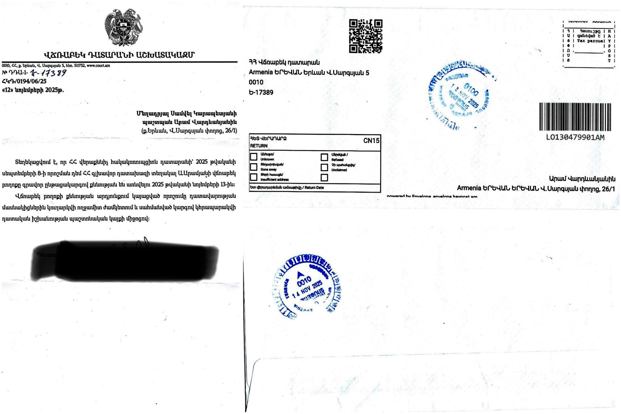 «Կից հրապարակում եմ տվյալը, ըստ որի Վճռաբեկ դատարանից փաստացի ելքագրվել է 2025 թվականի նոյեմբերի 13-ին գրություն, որը ստացվել է 2025 թվականի նոյեմբերի 14-ին: Գրության մեջ իբր թվագրված «նոյեմբերի 12» նշված է, որ Վճռաբեկ դատարանի որոշումը հրապարակվելու է նոյեմբերի 13-ին: Այսինքն, փաստացի 2025 թվականի նոյեմբերի 13-ին ծայրահեղ հրատապություն է սկսել Վճռաբեկ դատարանում: Մինչ այս պահը Սամվել Կարապետյանի պաշտպաններից որևէ մեկը չի ստացել Վճռաբեկ դատարանի որոշումը, սակայն Քննչական կոմիտեի 53 քննիչներից բաղկացած խմբի ղեկավարը ունեցել է ՎՃռաբեկ դատարանի որոշումը հենց նոյեմբերի 13-ին: Քննիչը ունեցել է որոշումն այնքան վաղ, որ հասցրել է դրան ծանոթանալ, մեջբերումներ կատարել և 2025 թվականի նոյեմբերի 13-ի ժամը 18-27-ին մուտք անել միջնորդությունը, կից փոխանցելով նաև Վճռաբեկ դատարանի որոշումը Հակակոռուպցիոն դատարան: Իրապես ինձ հետաքրքիր է՝ Գլխավոր դատախազության դիրքորոշումն իրադարձությունների նման զարգացման, փաստաթղթերի պատշաճության և այլ հարցերի վերաբերյալ»: