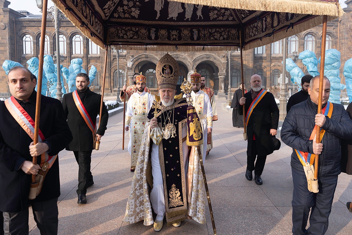 Հայրապետական խաչվառազարդ թափորը զանգերի ավետաբեր ղողանջների ներքո Ամենայն Հայոց Կաթողիկոսին Վեհարանից ամպհովանիով ուղեկցեց դեպի Մայր Տաճար: