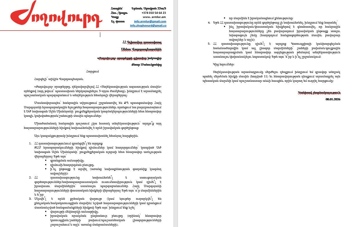 Գլխավոր դատախազը հովանավորում է Ալեն Սիմոնյանին. փաստաթուղթ. «Ժողովուրդ»