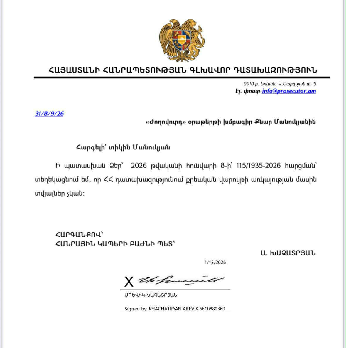 «Դատախազությունում քրեական վարույթի առկայության մասին տվյալներ չկան»։