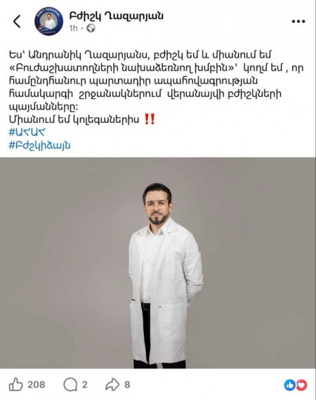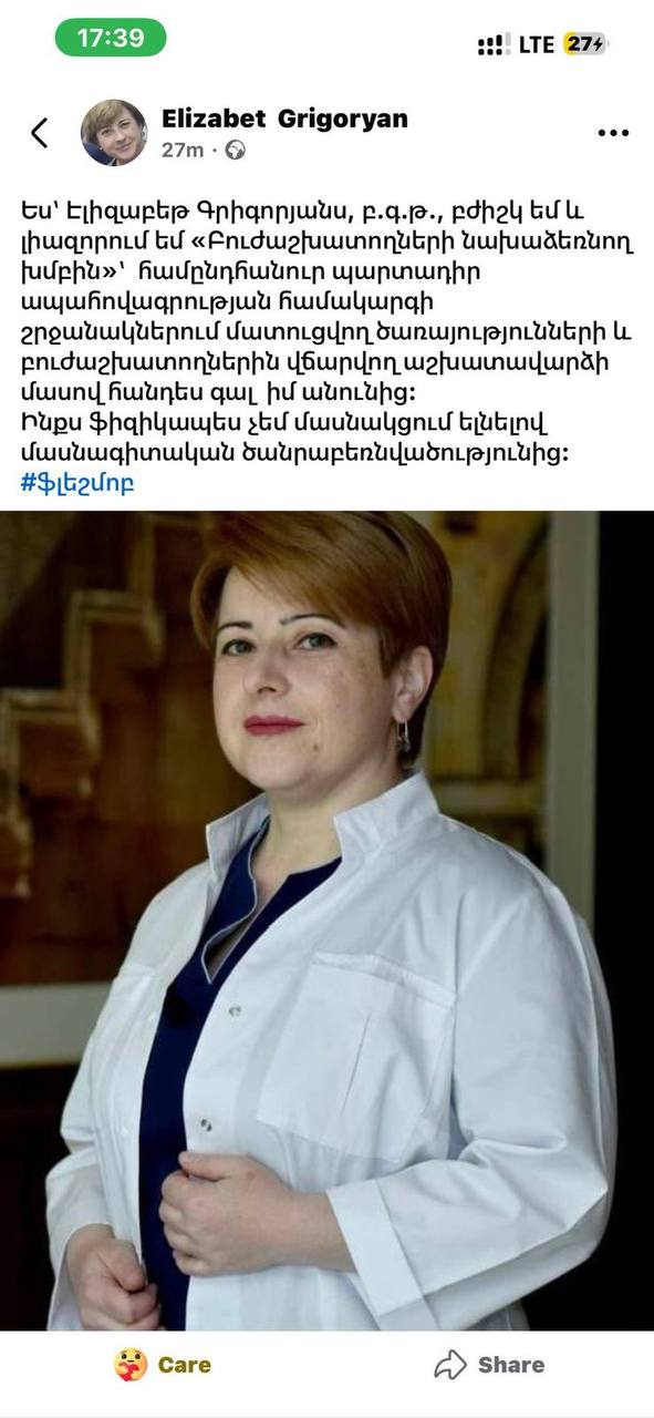 Բուժաշխատողները սոցիալական հարթակներում ֆլեշմոբ են սկսել՝ արձագանքելով առողջապահության նախարարության մամուլի խոսնակ Մարիամ Ծատրյանի գրառմանը, որը որոշ ժամանակ անց հեռացվել էր, սակայն հասցրել էր լայն արձագանք ստանալ մասնագիտական համայնքում։
