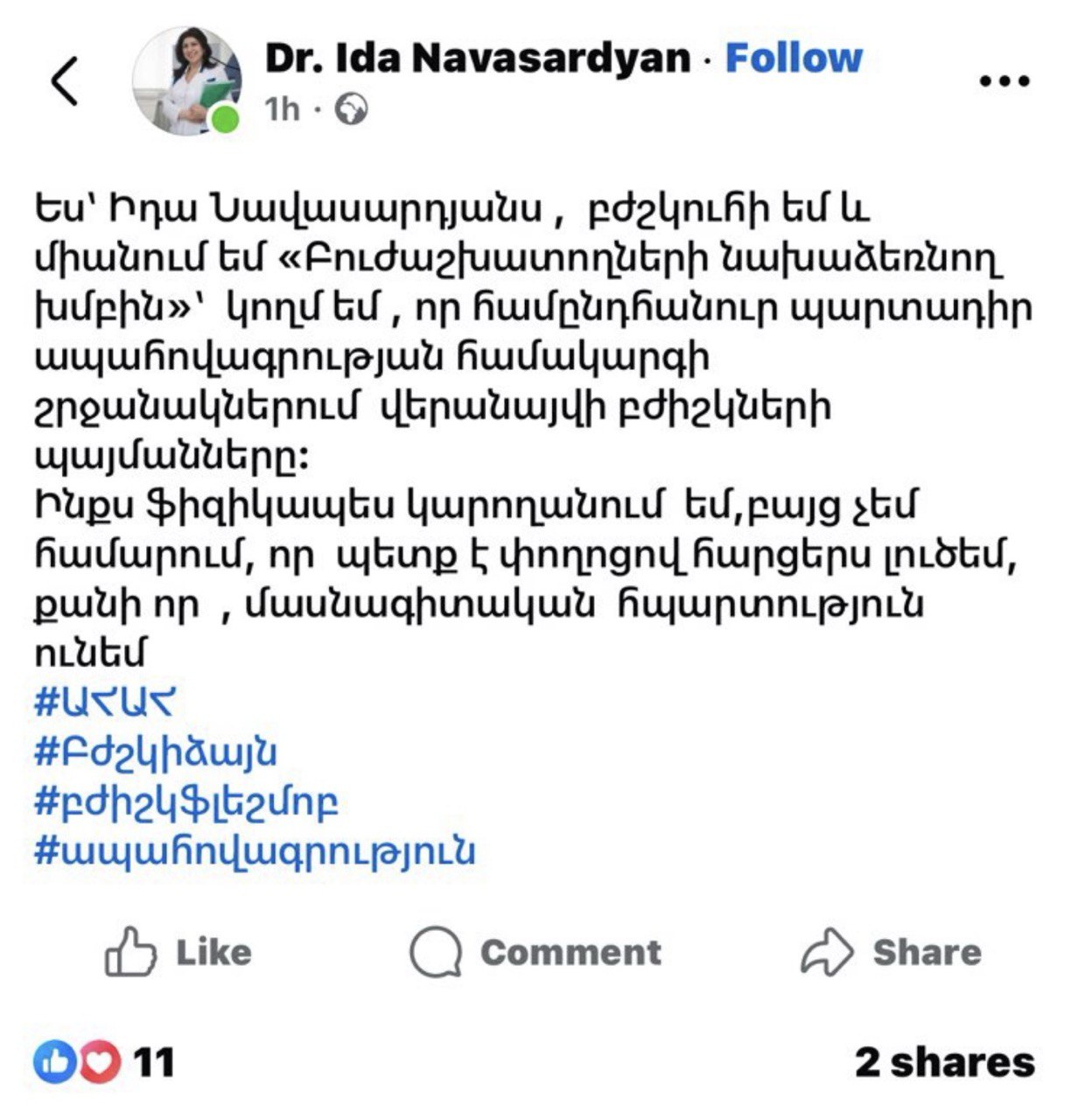 Խոսնակը իր գրառմամբ կասկածի տակ էր դրել այն, որ բուժաշխատողները դժգոհություններ ունեն․ «Որտե՞ղ են բուժաշխատողները, գուցե ճշտեիք՝ ո՞վ է լիազորել ՀԿ ներկայացնող երեք անձանց խոսել ՀՀ բոլոր բուժաշխատողների անունից»։