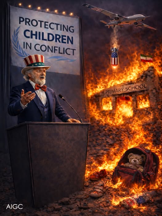 Հատկանշական է, որ պլակատային նկարների մի մասը նվիրված է ԱՄՆ-ի և Իսրայելի կողմից Իրանի Մինաբ քաղաքում տարրական դպրոցի ռմբակոծությանն ու դրա հետևանքով 150-ից ավելի աղջիկ երեխաների սպանության սահմռկեցուիչ եղելությանը: