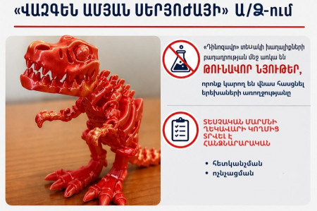 ՀՀ Շուկայի վերահսկողության տեսչական մարմինը վերահսկողական միջոցառումներ է իրականացրել «ՎԱԶԳԵՆ ԱՄՅԱՆ ՍԵՐՅՈԺԱՅԻ» Ա/Ձ-ում։ Տեսչական մարմնից հայտնում են, որ իրականացվել է խաղալիքի նմուշառում, որի արդյունքում պարզվել է, որ «Դինոզավր» անվանմամբ վաճառվող խաղալիքի բաղադրության մեջ առկա են երեխաների առողջության համար վտանգավոր (թունավոր) նյութեր։