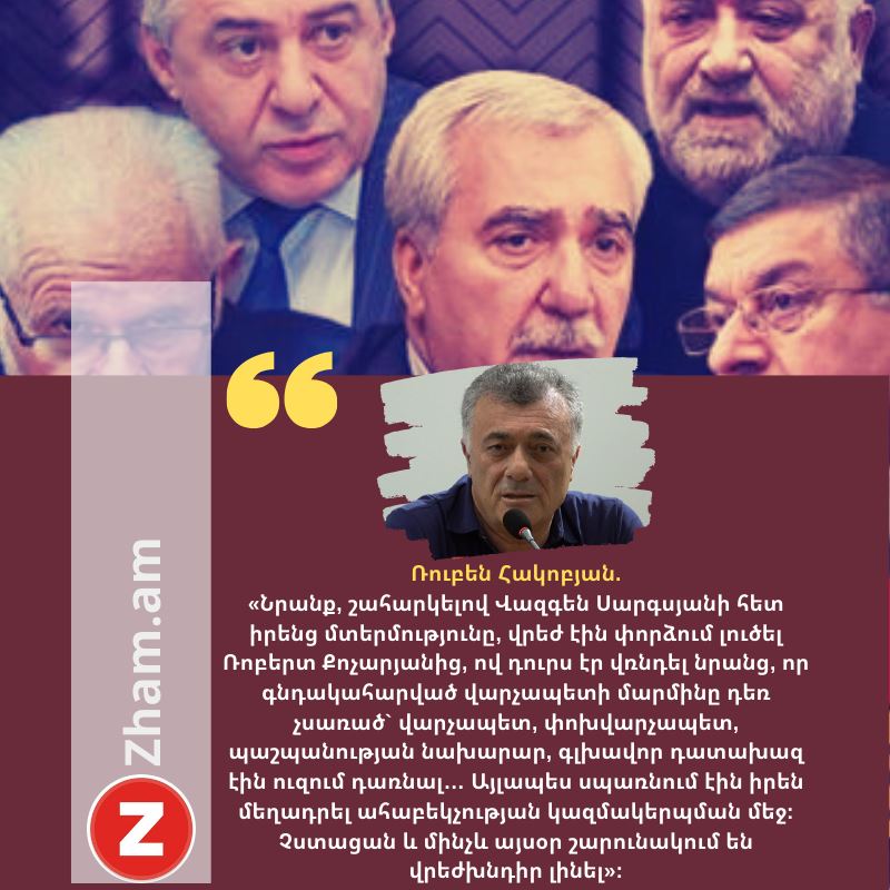 Ռուբեն Հակոբյան.«Դավադիրների այն խումբը, ովքեր այսօր շահագրգռված են բոլորովին այլ նպատակներով վերաբացել Հոկտեմբերի 27-ի գործը, հենց հիմնականում իրենք էին նախաքննությունն ուղղորդողները: