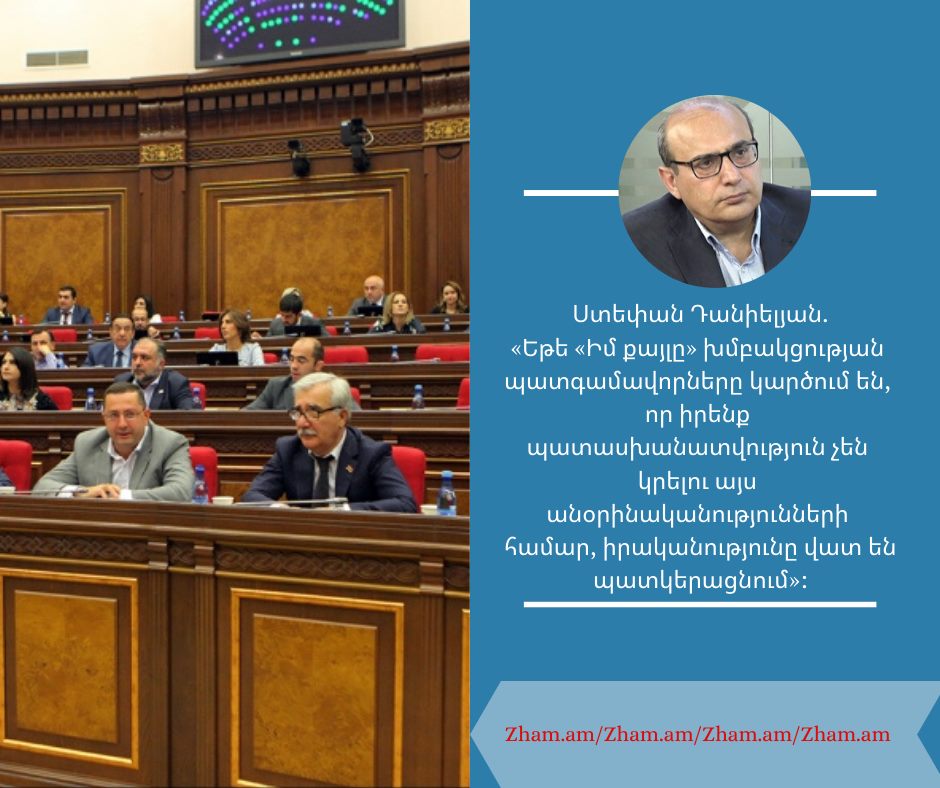 Ստեփան Դանիելյան.«Եթե «Իմ քայլը» խմբակցության պատգամավորները կարծում են, որ իրենք պատասխանատվություն չեն կրելու այս անօրինականությունների համար, իրականությունը վատ են պատկերացնում։ Խորհրդարանում սեղմած կոճակի, լուռ մնալու, անօրինականությունները չդատապարտելու համար բացատրություններ են տալու ու ոչ միայն»: