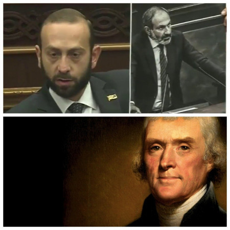 Այս հայտատարության ֆոնին հայ պատգամավորների խումբը փաստոնե մեկնել է ԱՄՆ և այնտեղ ծանոթանում է ամերիկյան ժողովրդավարական փորձին... Չեմ հասկանում էս ինչ հակահեղափոխական քայլեր եք անում: Էդ գնացել եք, որպեսզի ուսումնասիրեք, թե Թրամփին ոնց են իմպիչմենտ հայտարարում, էդ կարողա ուզում եք գաք ստեղ և մեր «սսնդափայլ ազգընտիր, Աստծո պարգևին» իմպիչմենտ հայտարարեք, մի հատ լրջացեք: