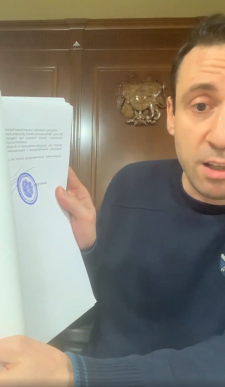 Ցույց է տալիս փաստաթուղթը պնդելով, որ ստորագրել է Հրաչյա Սարգսյանը, հերքելով իմ պնդումը։ Ուշադիր նայելու դեպքում ակնհայտ երևում է իր իսկ ցուցադրած թղթում, որ գրված է Հ․ Մարության: Հիմա էլ կասեն, թե թեք գծով փոխքաղաքապետն է ստորագրել։