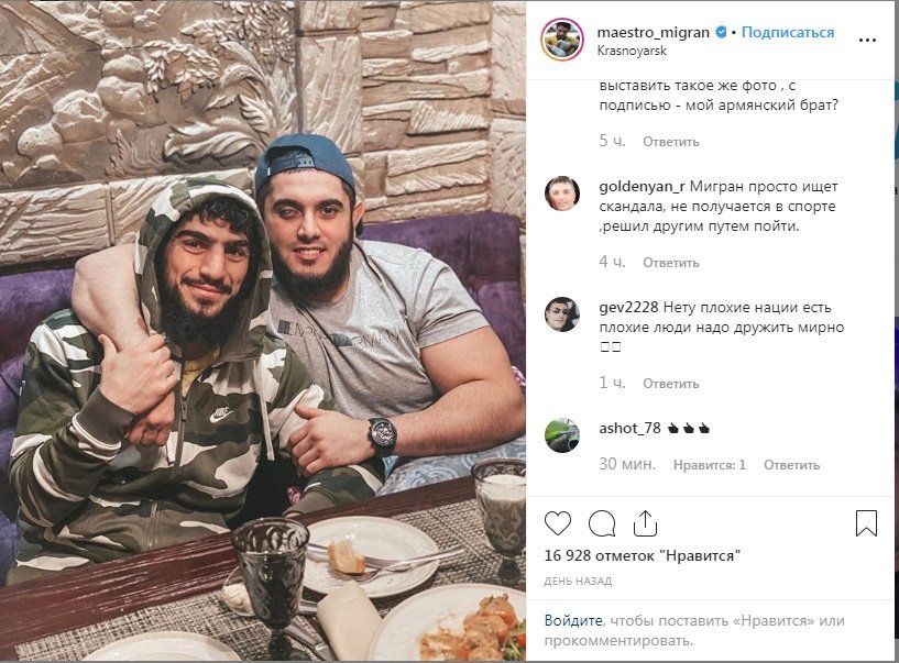 Օլիմպիական խաղերի փոխչեմպիոն, հունահռոմեական ոճի ռուսաստանաբնակ հայ ըմբշամարտիկ Միհրան Հարությունյանը Ինստագրամի իր էջում լուսանկար է հրապարակել և մակագրել. «Իմ արժանավոր ադրբեջանցի եղբոր՝ Ռուսլանի հետ»։