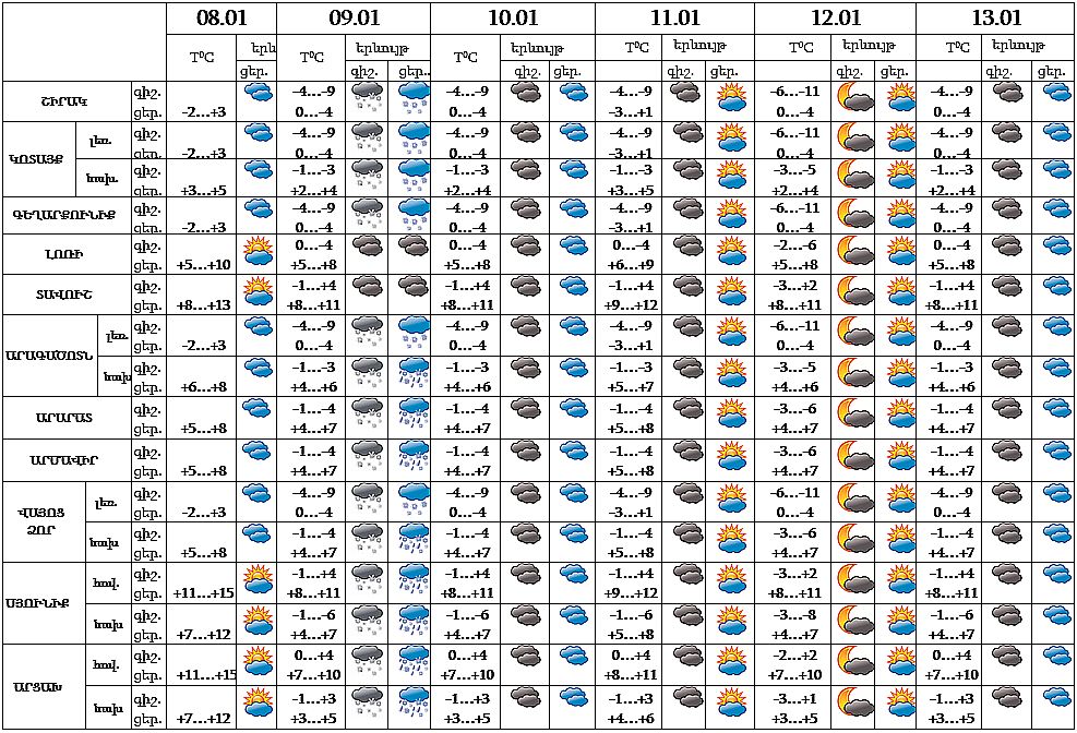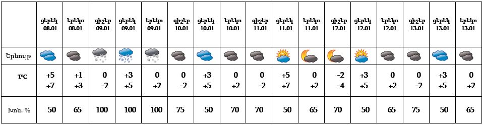 Երևան քաղաքում՝ հունվարի 8-ի ցերեկը, 10-13-ը սպասվում է առանց տեղումների եղանակ, 9-ին հնարավոր են թույլ տեղումներ: