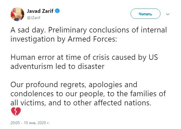 Իրանի ԱԳ նախարարն էլ ներողություն է խնդրել ու ցավակցություններ հայտնել ավիավթարի արդյունքում զոհվածների հարազատներին Twitter-ի իր էջում, նշելով, որ «մարդկային սխալը ճգնաժամի ընթացքում, որը հրահրվել էր ԱՄՆ-ի արկածախնդրության արդյունքում»։