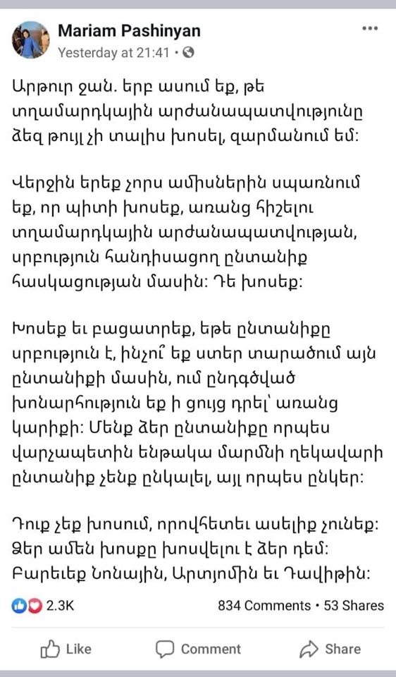 Մարիամ Փաշինյանի պոստի լայքերի զգալի մասը ֆեյք է. Լուսանկարներ
