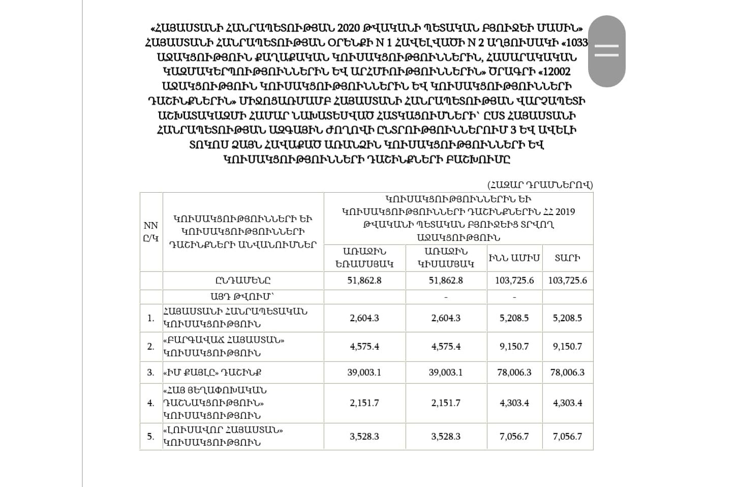 Կառավարությունը պատրաստվում է որպես աջակցություն ընդհանուր 103,725,000 դրամ հատկացնել «Իմ քայլին», ԲՀԿ-ին, ԼՀԿ-ին, ՀՀԿ-ին և ՀՅԴ-ին