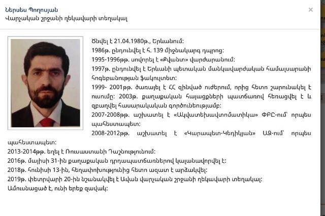 Արամ Մանուկյանից քիչ վեր Ներսես Պողոսյանն է, ում Ժիրայր Սէֆիլյանի գործով մեղադրանք էր առաջադրվել ՀՀ քրեական օրենսգրքի 235 հոդվածի 2-րդ մասով (Ապօրինի կերպով զենք, ռազմամթերք, պայթուցիկ նյութեր կամ պայթուցիկ սարքեր ձեռք բերելը, իրացնելը, պահելը, փոխադրելը կամ կրելը, որոնք կատարվել են մի խումբ անձանց կողմից նախնական համաձայնությամբ): Ներսես Պողոսյանն այս պահին Ավան վարչական շրջանի ղեկավարի տեղակալն է: