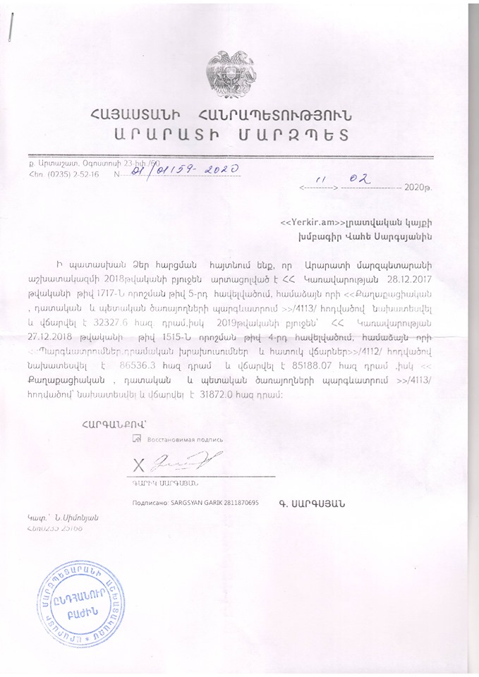 Yerkir.am-ը գրավոր հարցում էր ուղարկել Արարատի մարզպետ Գարիկ Սարգսյանի անունով՝ խնդրելով տեղեկություններ այն մասին, թե որքա՞ն է կազմել մարզպետարանի աշխատակիցներին վճարված պարգևավճարների չափը՝ 09.05.2018 թվականից մինչև 31.12.2019 թվականը: