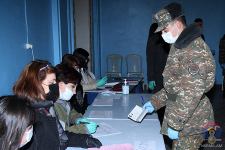 Նախքան տեղամասեր այցելելը, զինծառայողներին բաժանվում են պաշտպանիչ դիմակներ, ձեռնոցներ եւ ախտահանիչ միջոցներ. ՊԲ