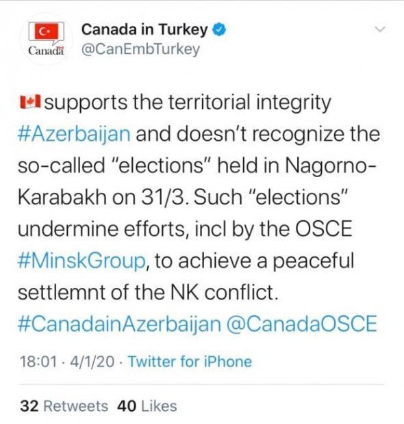 «Կանադան աջակցում է Ադրբեջանի տարածքային ամբողջականությունը եւ չի ճանաչում այսպես կոչված «ընտրությունները», որոնք տեղի են ունեցել Լեռնային Ղարաբաղում մարտի 31-ին։ Այդպիսի «ընտրությունները» վտանգում են այդ թվում ԵԱՀԿ Մինսկի խմբի ջանքերը` հասնելու Լեռնային Ղարաբաղի հակամարտության խաղաղ կարգավորման»,- ասված է գրառման մեջ։