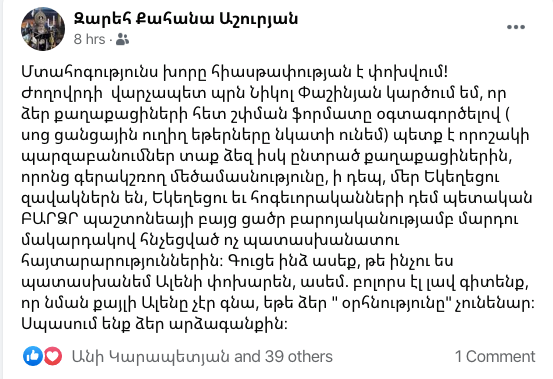 «Մտահոգությունս խորը հիասթափության է փոխվում: Ժողովրդի վարչապետ պրն Նիկոլ Փաշինյան կարծում եմ, որ ձեր քաղաքացիների հետ շփման ֆորմատը օգտագործելով (սոցցանցային ուղիղ եթերները նկատի ունեմ) պետք է որոշակի պարզաբանումներ տաք ձեզ իսկ ընտրած քաղաքացիներին, որոնց գերակշռող մեծամասնությունը, ի դեպ, մեր Եկեղեցու զավակներն են, Եկեղեցու եւ հոգեւորականների դեմ պետական ԲԱՐՁՐ պաշտոնեայի բայց ցածր բարոյական մակարդակով հնչեցված ոչ պատասխանատու հայտարարություններին։ Գուցե ինձ ասեք, թե ինչու, ես պատասխանեմ Ալենի փոխարեն, ասեմ. բոլորս էլ լավ գիտենք, որ նման քայլի Ալենը չէր գնա, եթե ձեր «օրհնությունը» չունենար։ Սպասում ենք ձեր արձագանքին»։