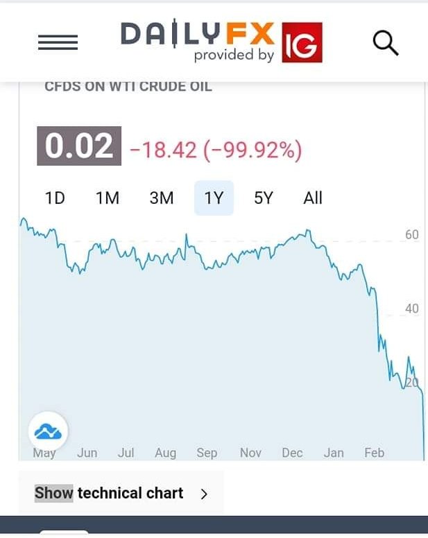WTI տեսակի նավթի 2020թ․ մայիսին մատակարարման ֆյուչերսի արժեքը փլուզվել է գրեթե 100%-ով`հասնելով մեկ բարելի համար 0,01 դոլարի, հայտնում է լոնդոնյան ICE բորսան, փոխանցում է ՏԱՍՍ-ը:
