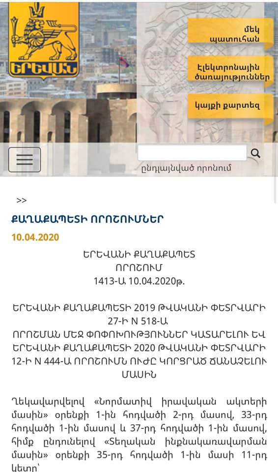 Հիշեցնեմ, որ նախարարի հրամանն ուժի մեջ է մտել սույն թվականի ապրիլի 11-ին, սակայն բախվում ենք հերթական անգամ քաղաքապետի պայծառատեսությանը: 10.04.2020 թվականին կայքում կա քաղաքապետի հրաման, որում հղում է արվում մեկ այլ հրամանի` 12.02.2020 թվականի «Երևան քաղաքի ենթակայության համայնքային ոչ առևտրային կազմակերպության գործադիր մարմնի ընտրության (նշանակման) մրցույթ անցկացնելու մասին» N 444-Ա որոշումը (կետ 2):