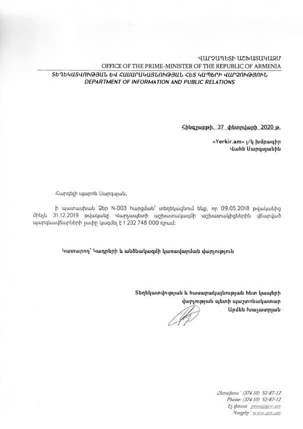 Ստացված գրավոր պատասխանից (կցվում է) տեղեկանում ենք, որ նշված շրջանում (20 ամիս) ՀՀ վարչապետի աշխատակազմի աշխատակիցներին վճարված պարգևավճարների չափը կազմել է 1.232.748.000 ՀՀ դրամ ( շուրջ $ 2.580.000 ):