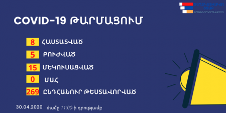 Արցախի տեղեկատվական շտաբը ներկայացնում է տվյալներ կորոնավիրուսի տարածման վերաբերյալ: Ըստ այդմ, ապրիլի 30-ի ժամը 11:00-ի դրությամբ՝ կա հաստատված 8, բուժման 5 դեպք, մեկուսացված 15 անձ, ընդհանուր թեստավորվածների թիվը 269 է: