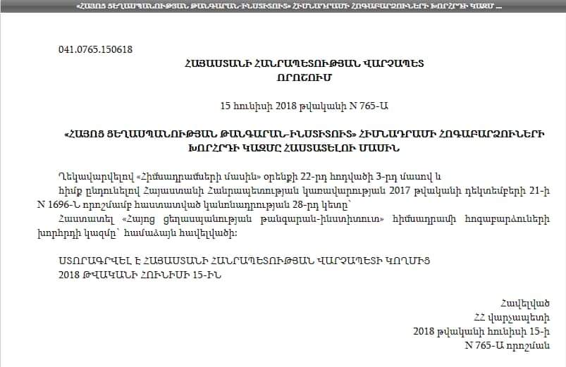2018 թվականի հունիսի 15-ին ՀՀ-ում իշխանությունը զավթելուց ընդամենը օրեր անց Նիկոլ Փաշինյանը ստորագրեց Հայոց ցեղասպանության թանգարան-ինստիտուտի հոգաբարձուների կազմում սորոսական Հրանուշ Խառատյանին ավելացնելու մասին որոշումը: Հիշեցնեմ, որ Հրանուշ Խառատյանին Ցեղասպանության թեմայի մեջ տեղավորելու օրերին նրա որդին` սորոսական Արսեն Խառատյանը, ՀՀ վարչապետի խորհրդականն էր: