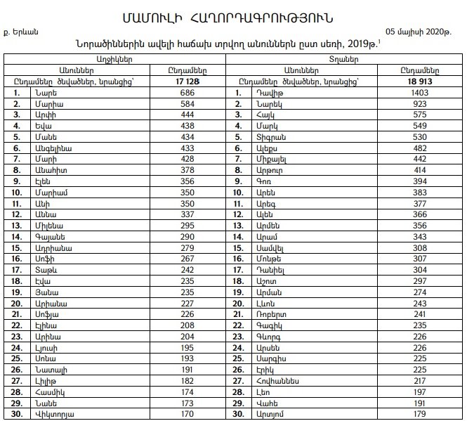 Հայաստանում 2019թ. նորածիններին ավելի հաճախ տրվող անունների առաջին հնգյակը հետևյալ տեսքն ունի: