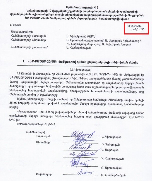 Ինձ համար մեծ հարցական է նաև, թե ինչո՞ւ է Երևանի քաղաքապետարանն ԱՅՍՕՐ 11:30 (հիշեցնեմ որ ուղիղ եթերս հեռարձակվեց այսօր 11:00) հրավիրում մրցութային հանձնաժողովի նիստ և միայն այսօր մրցույթը հանձնում մյուս մասնակցին»։