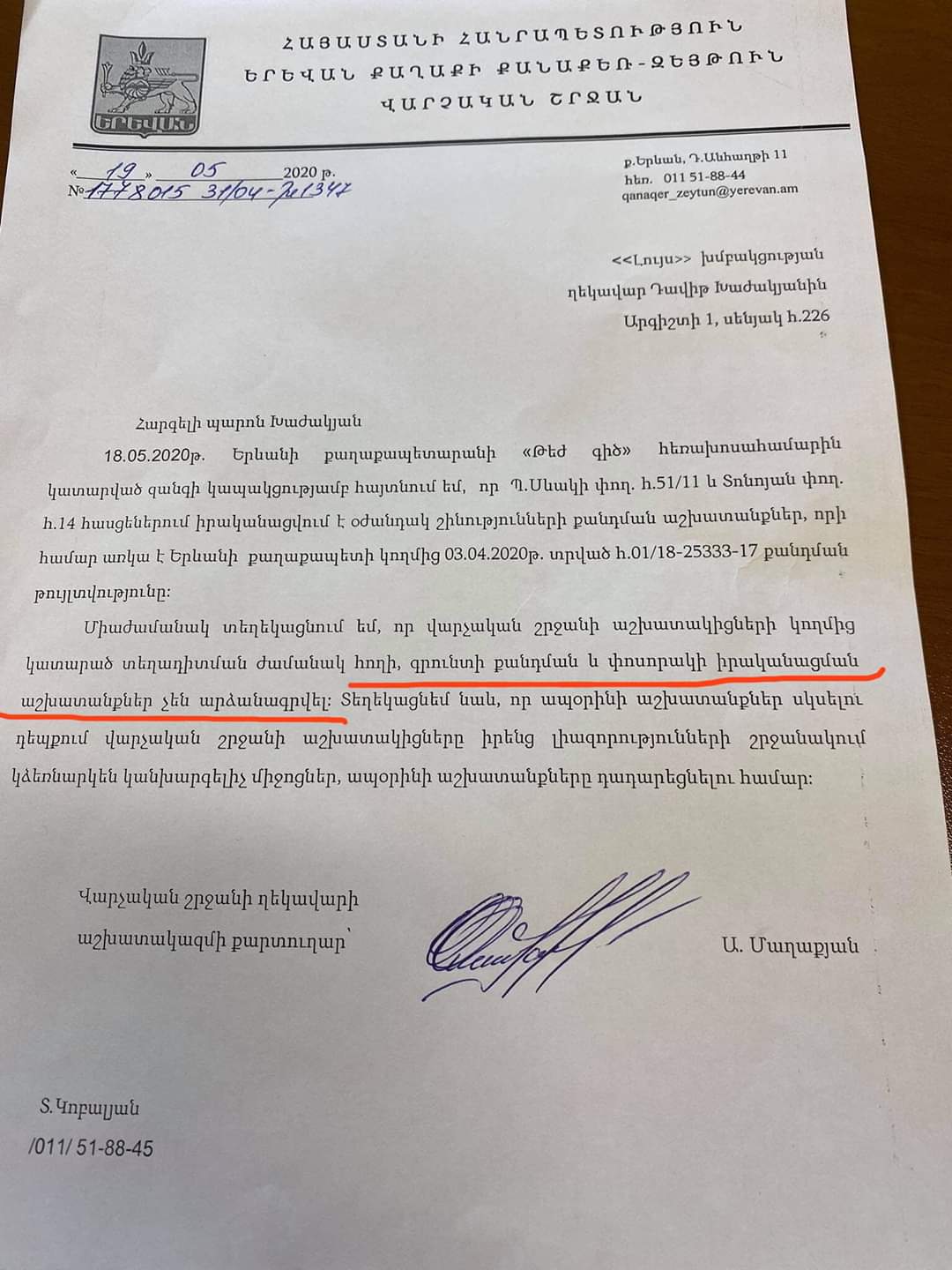 Թաղապետարանից գնացել են բարձրահարկ շենքի համար նախատեսվող փոսորակի (կատլավանի) քանդման տարածք և տեղադիտման ժամանակ այս մեծածավալ փորման աշխատանքները չեն նկատել: