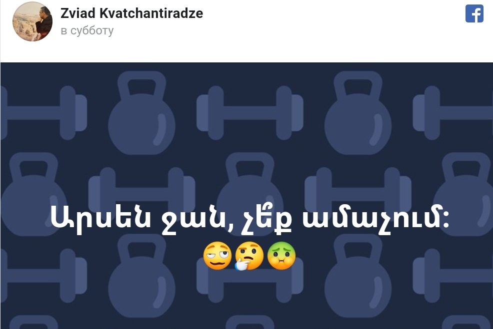 Վրաստանի խորհրդարանի պատգամավոր Զվիադ Կվաչանտիրաձեն իր ֆեյսբուքյան էջում հայերեն գրառում է արել՝ ուղղված ՀՀ առողջապահության նախարար Արսեն Թորոսյանին: