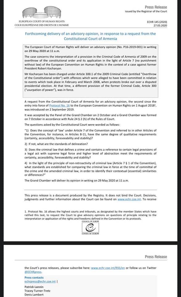 Մարդու իրավունքների եվրոպական դատարանը մայիսի 29-ին գրավոր կերպով կներկայացնի իր խորհրդատվական եզրակացությունը՝ 2009 թվականի ՀՀ ՔՕ այն դրույթի մեկնաբանության հետ կապված, որը վերաբերում է սահմանադրական կարգի տապալմանն ու դրա կիրառումը ՄԻԵԿ 7-րդ հոդվածի լույսի ներքո (պատիժ չկա առանց օրենքի) ՝ ՀՀ երկրորդ նախագահ Ռոբերտ Քոչարյանի գործի համատեքստում։ Այս մասին տեղեկանում ենք ՄԻԵԴ հաղորդագրությունից։