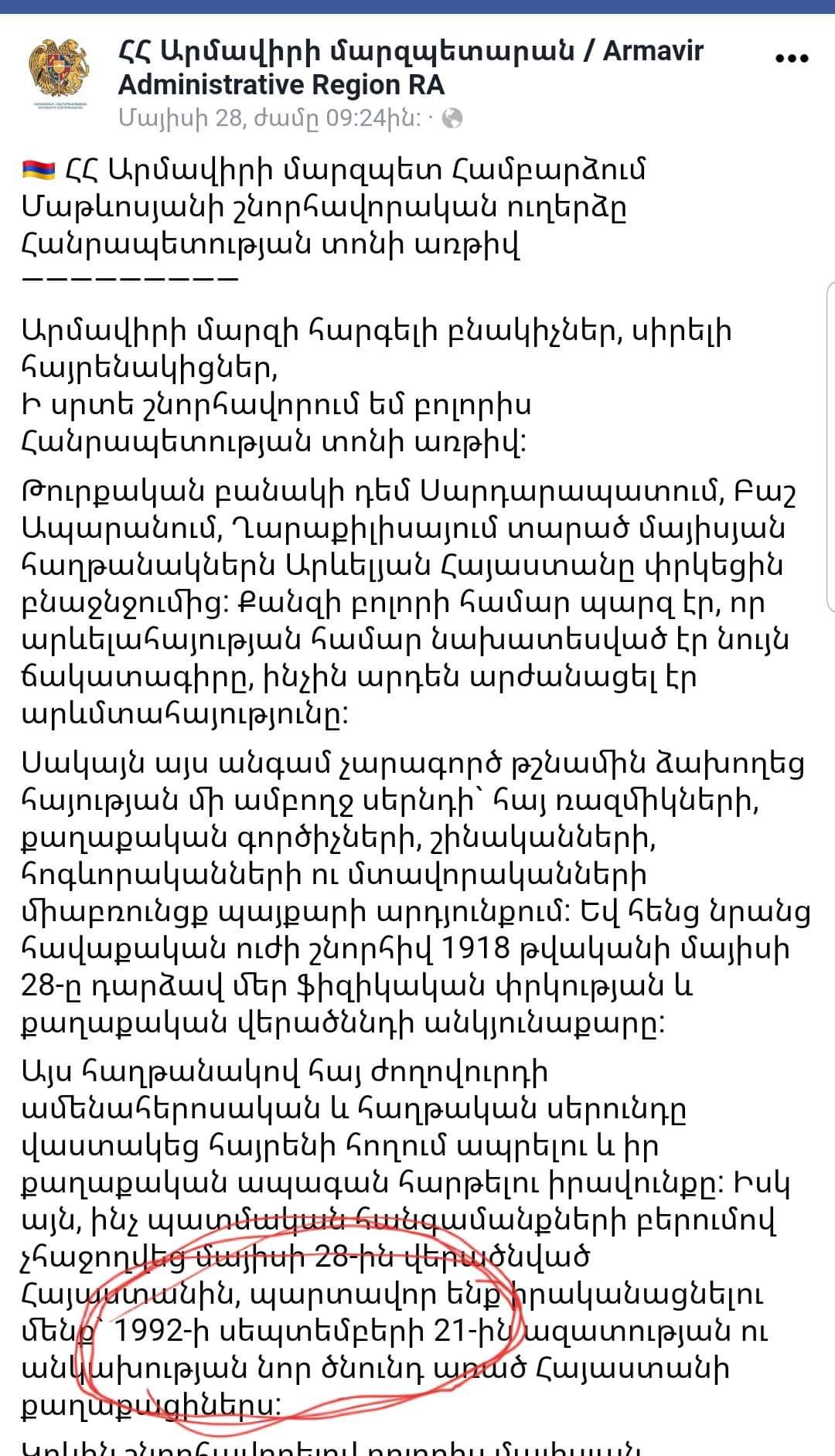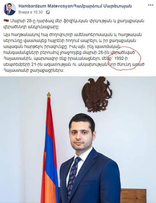 Հ.Գ. Ի դեպ, կարո՞ղ է մեկը բացատրել, թե ինչ է նշանակում այդ նախադասության՝ «...1992 թ. սեպտեմբերի 21֊ին ազատության և անկախության նոր ծնունդ առած Հայաստանի քաղաքացիներս» ձևակերպումը։