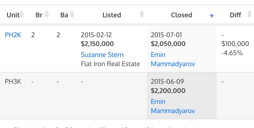 Եվ այսպես, Մամեդյարովի որդին ձեռք է բերել 2 բնակարան` պենտհաուսում, որոնք գտնվում են կողք կողքի, PH2K և PH3K համարներով: Բնակարններից մեկը արժեցել է 2,05 մլն, մյուսը` 2,2 մլն դոլար: Գործարքը կատարվել է կամ կանխիկով, կամ փոխանցումով, քանի որ որևէ տեսակի վարկ չի ձևակերպվել Էմինի անունով: Մեկ այլ հետաքրքիր հանգամանք, Մամեդյարովի որդին, Էմինը, գրանցված է "250 East Houston Street #6D, Manhattan, NY” հասցեյում գտնվող բնակարանում, որը հավանաբար կրկին իրեն է պատկանում: Այդ բնակարանի արժեքը կազմում է 989,894 դոլար: