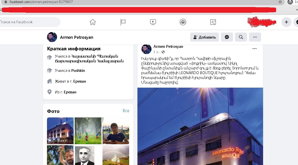 Արմեն Պետրոսյանը ֆեյսբուքյան իր էջում գրում է․ «Իսկ դուք գիտեի՞ք, որ Պատրոն Դավիթի օֆշորային ընկերությունից ստացված «փոքրիկ» ատկատով Նիկոլ Փաշինյանի ընտանիքն անշարժ գույք է ձեռք բերել Տորոնտոյում և բաժնեմաս Ցյուրիխի LEONARDO BOUTIQUE հյուրանոցում: Դեռևս հրապարակում եմ Ցյուրիխի հյուրանոցի նկարը: