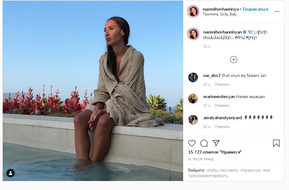 Instagram-յան էջում հրապարակված կադրերում Նազենին պատկերված է գեղեցիկ բնապատկերի ֆոնին։ Նա բեժ գույնի վերնազգեստ է կրում, արձակել է մազերը։ «Հե՜յ գիտի ժամանակներ…»,- հրապարակումը մակագրել է դերասանուհին՝ օգտագործելով «ծով», «ջուր» հեշթեգերը։